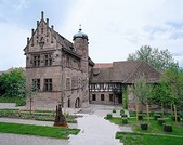 Schloß Faber-Castell | Stein - Mit den romanisierenden Bögen und Säulen, Rund- und Ecktürmen ist die Außenfassade mittelalterlich anmutend. Im Innern wechseln auf beeindruckend vielfältige Weise Stilepochen von Romanik, Gotik, Renaissance, über Empire und Klassizismus bis hin zur damals modernsten, dem Jugendstil.