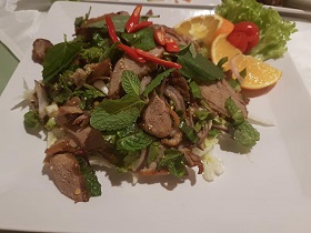 In Fürth bei "Aroi", Nähe Rathaus. Das Essen ist nicht wirklich Thai, aber das ist ja bei 90% der deutschen Thairestaurants so. Dennoch gefällt es mir. Ich finde es hier echt gemütlich und die nette Besitzerin und ihr Sohn sind wahre Künstler, die Gäste zum Lächeln zu bringen. (Der Schnapps auf Kosten des Hauses hilft vielleicht, aber ich habe den nicht getrunken und fand es trotzdem gut.) Ich denke die Laune der Gäste spricht für sich - alle sind gut gelaunt und am Lachen. Mein Essen (Foto) war Grünes Curry mit Ente. Wie fast überall habe ich die Hauptzutaten, naemlich Thai Basilikum und Thai Auberginen, vermisst. Es war dennoch schmackhaft und wenigstens konnte ich der mangelnden Schärfe mit "Prik Nam Phla" und groben Chili-Flocken (stand auf dem Tisch) etwas auf die Sprünge helfen. Das Gericht kostete €9,50 und das Chang Bier €2,50. Ich habe es nicht bereut und würde wegen der netten Atmosphäre gern wiederkommen.