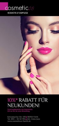 | Cosmeticos Schwabacher Str. 129, 90763 Fürth Telefon: 0911 9234793 HERZLICH WILLKOMMEN BEI COSMETICOS Kosmetikerin zu sein, ist für mich nicht nur ein Beruf! Von höchster Priorität ist für mich das Wohlbefinden der Kunden während der gesamten Behandlungszeit. Dabei arbeite ich mit höchster Hingabe, Engagement und voller Perfektion, um das Gefühl der Zufriedenheit und das Willkommen sein der Kunden sicher zu stellen. Nach 5 Jahren Berufserfahrung konnte ich nun meinen Traum vom eigenen Kosmetikstudio wahr werden lassen. Seit Oktober 2009 darf ich Sie in Fürth herzlich begrüßen und freue mich auf Ihren Besuch. – geprüfte Kosmetikerin/Fußpflegerin seit 2004 Ihre Irene Joos |