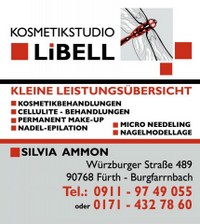 | Kosmetikstudio Libell Würzburger Str. 489, 90768 Fürth – Burgfarrnbach Telefon: 0171 4327860 WILLKOMMEN BEIM KOSMETIKSTUDIO LIBELL Wenn auch Sie einmal Ihren Alltag vergessen und sich richtig entspannen wollen, sind Sie bei mir genau richtig. Ich biete Ihnen die Möglichkeit, sich von Kopf bis Fuß verwöhnen zu lassen. Es erwartet Sie ein umfangreiches, individuelles Behandlungsangebot. Mein Leistungsspektum erstreckt sich auf fast alles, was gerade „In“ oder gerade erst im Kommen ist: Dauerhafte Haarentfernung, Nadelepilation, Enthaarung Kosmetische Behandlung: Micro-Needling, Diamant Mikrodermabrasion, Körperbehandung Slimyonik® Bodystyler Massage |