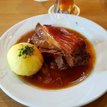 Die Einrichtung wirkt etwas altertümlich und es könnte mal wieder renoviert werden. Wir haben uns aber nicht unwohl gefühlt. Für den Trubel war es auch überraschend sauber. Die Begrüßung durch die resolute Grand Dame des Hauses war nicht gerade warmherzich, aber auch nicht unfreundlich. Es war halt ziemlich stressig. Das restliche Personal war sehr freundlich. Wir wurden sehr schnell bedient und hatten nach kürzester Zeit unsere Getränke und das Essen. Die Sonntagskarte ist sehr umfangreich. Wir hatten Schäuferla mit Kloß und Soß‘, dabei ist ein kleiner Salat. Der Salat ist nichts Besonderes, aber auch nicht schlecht. Das Essen war heiß und lecker. Die Portionen waren so groß, dass wir gegen Ende kämpfen mussten. 2 Schäuferla, 1 Weizen und 1 Radler für knapp 27,-€. Wir sind der Meinung, dass das Preis-Leistungs-Verhältnis stimmt. Wir fanden es nicht schlecht und kommen gern wieder.