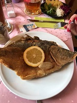 Diese Woche hatte ich mal wieder Karpfen im Stadtwappen und dieses bleibt bei mir persönlich weiterhin auf Platz 1 in Fürth. Mittlerer halber Karpen, gebacken, leider ohne Ingraisch, dafür mit sehr gutem (wie immer) Kartoffelsalat für 12,90 €. Freundlicher Service, prima Nachtisch, lecker Schnaps.