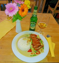 In Fürth bei "Aroi", Nähe Rathaus. Das Essen ist nicht wirklich Thai, aber das ist ja bei 90% der deutschen Thairestaurants so. Dennoch gefällt es mir. Ich finde es hier echt gemütlich und die nette Besitzerin und ihr Sohn sind wahre Künstler, die Gäste zum Lächeln zu bringen. (Der Schnapps auf Kosten des Hauses hilft vielleicht, aber ich habe den nicht getrunken und fand es trotzdem gut.) Ich denke die Laune der Gäste spricht für sich - alle sind gut gelaunt und am Lachen. Mein Essen (Foto) war Grünes Curry mit Ente. Wie fast überall habe ich die Hauptzutaten, naemlich Thai Basilikum und Thai Auberginen, vermisst. Es war dennoch schmackhaft und wenigstens konnte ich der mangelnden Schärfe mit "Prik Nam Phla" und groben Chili-Flocken (stand auf dem Tisch) etwas auf die Sprünge helfen. Das Gericht kostete €9,50 und das Chang Bier €2,50. Ich habe es nicht bereut und würde wegen der netten Atmosphäre gern wiederkommen.